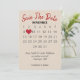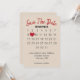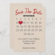 "Save the Date" Kalender mit rotem Herz auf hellbeige Prägung Hintergrund für die kommende Hochzeit. Text ist bearbeitbar. Der Monat kann geändert werden. Legen Sie das rote Herz auf das Datum Ihrer Hochzeit.