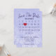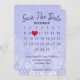 "Save the Date" Kalender mit rotem Herz auf pastellfarbenen lila Schneeflockenmuster für die kommende Hochzeit. Text ist bearbeitbar. Der Monat kann bearbeitet werden. Legen Sie das rote Herz auf das Datum Ihrer Hochzeit. Der Hintergrund kann geändert werden.