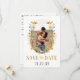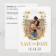Diese "Save the Date"-Karte zeigt Ihr Foto, umgeben von einem blumengeschmückten Kranz aus gelben, weißen und violetten Blumen, der ein warmes und einladendes Ambiente schafft. Unterhalb des Bildes wird der Text "SAVE THE DATE" in Gold, fett Schriftart angezeigt, und fügt eine Touch der Raffinesse hinzu. Das Datum wird am unteren Rand deutlich zentriert in einem sauberen, schwarzen Serif-Schriftart. Das Gesamtbild harmoniert mit einer modernen und rustikalen Ästhetik, perfekt für ein naturliebes Paar.