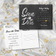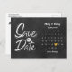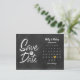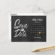 Diese boho-Save the Date-Karte zeigt einen Kalender und eine hübsche goldene Liebe, die Ihr besonderes Datum auf einem Chalkboard-Hintergrund hervorhebt. Die Rückseite hat zusätzliche Save the Date Details, einschließlich Ihrer Hochzeitswebsite, mit Ihrer Rücksendeadresse und Platz für die Adresse Ihres Empfängers.