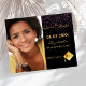 Eine Foto-Save the Date-Karte für eine Graduiertenparty. vorne: Fügen Sie Ihr eigenes Foto in vertikaler Größe des Absolventen hinzu. Eine schicke schwarze Hintergrundfarbe und lila Konfetti sprinkle. Vorlagen für Namen und Datum. Goldene Buchstaben. Der Name und der Text: Save the Date sind mit einem modernen handgeschriebenen Stilskript geschrieben. Mit einem modernen abstrakten Imitat Goldkappe, Tassel Topper. Zurück: Einzelheiten zum Party. 1 Blatt = 1 Save the Date Seite bis Kante