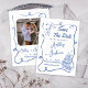 Whimsical Blue Cake Hand Drawn Save the Date Card Blue Line gezeichnete Hochzeit speichern das Datum mit einer Champagnerflasche, Hochzeitskuchen, Glas, Trauben und mehr. Das Foto für Paare wird auf der Rückseite der Karte angezeigt.