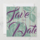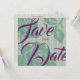Diese Save the Date Card bietet einen eleganten, übergroßen, pflaumenfarbenen Schriftart mit durchsichtigen Hintergrundschichten von grünen Rose und grünen und rosa Streifen. Alle Exemplare sind editierbar, klicken Sie auf die Schaltfläche Personalisieren, um dies zu Ihrem eigenen zu machen, genießen!