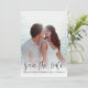 Ihr Foto in der 12x18 Verlobung ist mit einem einfachen, eleganten handgeschriebenen Kalligraphietext, "Save the Date" und Ihren Namen, Ihrem Hochzeitstermin und Ihrer Location versehen. Sie können die Hintergrundfarbe oder das Design leicht ändern.