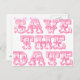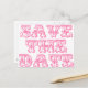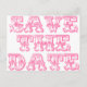 Herrlicher Vintager Schriftart in Rosa mit der Meldung "Save the Date" füllen Sie den ganzen Platz auf der Vorderseite der Karte. Stilvolles und originelles Design, würde ein traditionelles Thema und ein modernes, eigenartiges Design Anzug. Andere Farben sind in meinem Shop unter der Rubrik "Slogan" erhältlich.