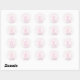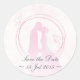 Ein wunderschönes romantisches Hochzeitsdesign-Set mit runden Aufklebern, das die gerahmten kissenden Silhouetten der Braut und Bräutigam vor einem traumhaft rosa Hintergrund zeigt, mit individualisierbarem Datum und "Save the Date" am unteren Ende.