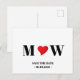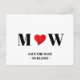 Save the Date rotes Herz angepasste Paar monogramm Initialen moderne Typografie minimalistisch elegante Hochzeitsankündigung Postcard. Hochzeit Speichern Sie die Einladung Datum, Postkarte. Benutzerdefinierte schwarze Initialen, rotes Herz mit vollständig anpassbarem Text. Weißer Hintergrund. Karo der Erholung der Auflistung für die Abstimmung der Elemente.