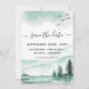 Rustikale Waldfarbe Grüne Hochzeit Save the Date Card auf weißem Hintergrund - beinhaltet eine schöne und elegante Schriftzeichen mit modernen Bäumen, Bergen und Vögeln für die besondere Hochzeitstagsfeier.