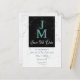 Mit diesem eleganten aquamarinen Monogramm auf weißem und schwarzem Marmor Save the Date Postcard verkünden Sie Ihr Hochzeitstag. Alle Artikel sind anpassbar: Datum, Namen, Stadt und Staat. Hat Rücksendeadresse zurück. Schickt zu Verwandten und Freunden.