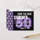 Hier ist eine trendige Save the Date Postkarte in lila und schwarz für eine überraschende 50. Geburtstagsparty. Spaß! Der gesamte Text ist anpassbar.