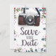 Save the Date Vintage Kamera - Hochzeit Verlobung laden mit einem Blumenriff ein.