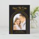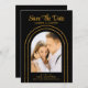 Save the Date Black Gold Stilvolle Script Art Deco Wedding Cards bietet Ihr Lieblings-Foto in einem goldenen Bogen auf einem schwarzen Hintergrund. Personalisieren Sie Ihren Text, indem Sie den Text in den dafür vorgesehenen Textfeldern bearbeiten. Entwickelt für Sie von ©Evco Studio www.zazzle.com/store/evcostudio