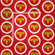 "Gules, der Kopf eines Widders verkabelt oder innerhalb eines Bordürs." Allover Muster des Abzeichens der Bevölkerung für die Baronie von Ramshaven in der Gesellschaft für kreativen Anachronismus.