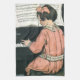 Vintage Illustratorin von Jessie Willcox Smith mit einer kleinen Pianistin, die ihren Klavierunterricht praktiziert. Auf dem Klavier ist Notenblatt, und sie trägt ein rosa Kleid mit einem Bogen im Haar.