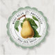 Diese elegante Jakobsmuschel bewahrt das Etikett mit Ihrem Produktnamen, Ihrer Stadt & Staat, Ihrem Netzgewicht, Ihrer Erklärung für Nachhaltigkeit und Herkunft und Ihrer Zutatenliste auf. Vintage Pear-Abbildung. Kontaktinformationen auf der Rückseite des Labels mit kleinem Herz.