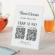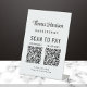 Benutzerdefiniertes Tischschild für Ihr Unternehmen mit Ihrem Namen oder Ihrer Marke in einem stilvollen Signaturskript, 2 QR-Codes für Kunden, die auf kontaktlose Zahlung suchen, und Ihrem Geschäftstyp oder Ihrem Firmentitel, Telefonnummer und Straßenadresse oder anderen Text in einfacher Schrift.