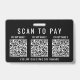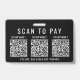 Modern black badge for your business to collect payments on the go with the option to upload 3 QR codes for different contactless payment apps for customers to scan for payments. Upload your QR codes and add your business name in simple white lettering.