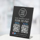 Einfaches modernes Tischschild mit schwarzem Podest für Ihr Geschäft mit Venmo- und Paypal QR-Codes für Kunden, die nach Zahlungen suchen. Fügen Sie Ihr Logo, QR-Codes und Firmennamen, Telefonnummer und Website in einfacher weißer Schrift hinzu. Fügen Sie Ihre instagram und facebook Benutzer-ID für Kunden, um Ihnen auf Social Media folgen.