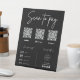 This sleek and modern "Scan to Pay" QR code sign is the perfect way to streamline your customers' payment process. Featuring a clean and professional design, the sign prominently displays multiple QR codes for popular payment apps like Venmo, Cash App, and PayPal, along with icons for other accepted payment methods like cash, credit card, Apple Pay and Google Pay. You can even add your own logo and contact information to create a fully customized and branded look. This versatile black and white sign is ideal for businesses of all sizes and can be easily displayed on a countertop or table.