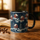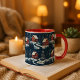 This striking coffee mug features a bold, seamless repeating pattern inspired by traditional Scandinavian folk art. The illustration depicts cozy red cottages and stylized evergreen trees against a dark, snowy background. The high-contrast design creates a warm and nostalgic winter atmosphere, perfect for curling up by the fire. This unique mug is a lovely holiday gift for those who cherish Nordic design, graphic patterns, or distinctive home décor during the winter season.