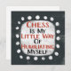 Ein unehrenhafter typografischer Entwurf, der sagt: "Schach ist mein kleiner Weg, mich selbst zu demütigen". Es ist mit schwarzem und rotem Text auf einem weißen Rechteck mit funky, spielerisch weißen Punkten umgeben, die alle auf einem dunkelgrauen Hintergrund liegen.