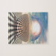 Genießen Sie dieses surreale, dreidimensionale digitale Kunstwerk einer reflektierenden Metallkugel, die auf einer schwarz-bräunlichen Schachbretter-Oberfläche ruht.