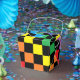 Abstrakte Digitalkunst von schwarz- und regenbogenfarbenen Quadraten in karierten Formationen.