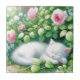 Das süße, weiße Kätzchen schläft unter einem Rose-Busch voller rosa Rosen. Ai Kunst in einem Aquarell-Stil gemacht.