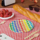 Abstrakte Digitalkunst von beige- und regenbogenfarbenen Quadraten in karierten Formationen.