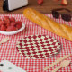Abstrakte Digitalkunst von bordeauxroten und cremefarbenen Quadraten in karierter Form.