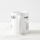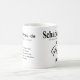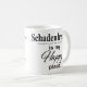 Die weiße Kaffeemaschine mit schwarzem Text enthält die Worte "Schadenfreude (aber nur für bestimmte, ganz besondere Leute) ist mein Glücksbringer". Die Definition des deutschen Wortes "Schadenfreude" liegt auf der anderen Seite der Tasse.