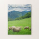 Landschaftliche Szene: flauschige schwarz-weiße Schafe, die durch die Weide laufen. Rustikale Touch des Landzaubers für Tierfreunde und Reisende. Sie können dieses Design personalisieren, indem Sie den Text "Berge sind gewartet" durch Ihre eigene Nachricht ersetzen.