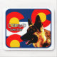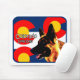 Beschreibung der grafischen Kunst eines Schäferhundhundes gegen den Hintergrund einer stilisierten Colorado-Flagge