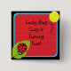 Ein Ladybug auf einem grünen Blatt, ein gelber Ballon, ein Hintergrund aus rot, blau und schwarz, und ein Bereich, den Sie auf einem Knopf anpassen können, der zu unserem Glücklichen Bug Geburtstag lädt, Aufkleber und Porto-Briefmarke.