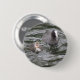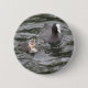 Dieser Knopf zeigt ein Foto von einem Coot und ihrem Küken, das auf einem Flussufer schwimmt. Das Weibchen ist grau mit einem weißen Pflaster auf dem Kopf und roten Augen, während das winzige, flauschige Küken mit einer weißen Vorderseite blassgrau ist.