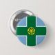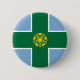Round Button mit Design mit einer Fahne des historischen Landkreises von Derbyshire in England, Großbritannien; blaue Fahne mit grünem Kreuz und goldener Tudor-Rose in der Mitte