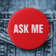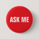 Rot und weiß "Frag mir" Pinback-Taste. Benutzen Sie dieses Etikett für Geschäftsleute, Schulen, Wohltätigkeiten, Veranstaltungen usw.