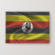 Button mit der Fahne von Uganda in gewelltem Stoffdesign. Dieses Design zeichnet sich durch die Ugandaner Fahnen Farben und Design mit einem schönen schwingenden Material texturiert Effekt. Dieses Flaggendesign ist eine großartige Möglichkeit, Ihnen zu zeigen, dass Sie stolz sind, aus Uganda zu kommen.