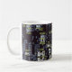 Kaffee von einer Schaltungsbrett-Tasse. Ein moderner Elektronikentwurf für die mit einem Geschmack für Geräte. Eine Druckleiterplatte, die beschriftete elektronische Bauelemente kennzeichnet - Widerstände, Kondensatoren, Dioden - in einer ästhetischen Kunst und in einer Entwurfsanordnung auf dieser Tasse. Der "Widerstand ist vergeblicher" Entwurf erscheint auf einigen Geschenken für Geeks, Nerds und normale Leute mit einem Interesse an der Elektronik, an den Geräten oder gerade an den ungewöhnlichen einzigartigen Geschenken, die Aufmerksamkeit und Interesse anziehen.