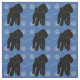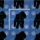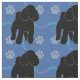 Dieser lustige, niedliche Schwarz-Schatten-Silhouette-Stil Poodle steht mit einem Lächeln, vor einem blauen Hintergrund mit Pfotenabzügen und Tracks in Grau, Blau und Rosa. Design von Diane Blackman. Das gleiche Design ist auch bei anderen lustigen Hundebildern erhältlich.