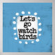 Eine niedliche Vogelbeobachtung typografisches Design, das sagt: "Lass uns Vögel beobachten". Es ist schwarzer Text auf einem weißen Rechteck mit funky, spielerischen Punkten, die ihn umgeben, alles auf einem hellblauen Hintergrund.