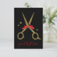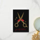 Diese goldene Glitzer-Schere macht eine perfekte Karte für Ihr Geschäft. Text leicht anzupassen! Eine klassische Farbkombination aus Schwarz und Gold. Elegante, stylistische Vorlage mit rotem Band.