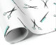 Weißes Packpapier mit einem Muster der Kämme und der Scheren im Schwarzen und im Türkis.