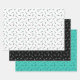 Haarstylistische Papierfolien mit drei Mustern mit Schere und Kämmen in verschiedenen Kombinationen aus weiß, aquamarin und schwarz.