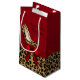 Schicke kleine Geschenktasche getan in tiefrotem, mit Grafiken eines Brauns, des Schwarzen und tan wilden des Jaguardruckes, entlang der unteren Hälfte der Tasche. Elegante Grafiken eines roten Satinbandes, Läufe um die Mitte der Tasche, wenn der rote Satin Bögen schaut, auf der Front und der Rückseite. Grafik eines modernen Paares hohen Heelses des Jaguarmuster-Stiletts verzieren die Front und die Rückseite, der Tasche. Personifizieren Sie den schwarzen Text, zum Anzug Ihr Bedarf. Zusammenpassendes Seidenpapier verfügbar.