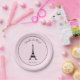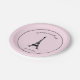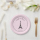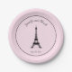 Dieser elegante, französische Arthochzeits-Papier-Teller kennzeichnet ein schwarzes Bild des Eiffel-Turms auf einem rosa Hintergrund. Personalisiert mit Ihren Hochzeitsinformationen im schwarzen Franzose-und Kunst-Dekoarttext. Ein sehr Pariser und ein Chic suchen nach Ihrer Hochzeit.