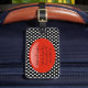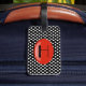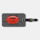 Hübscher Gepäckumbau getan in einem Schwarzweiss-Polkapunktmuster. Grafiken eines roten ovalen Textbereichs des Shinny, auf der Front und der Rückseite hat schwarzen Namen und eine Adresse, auf der Front und ein großes Buchstabemonogramm, auf dem hinteren, bereit, die perfekte Weise zu personifizieren, Ihr Gepäck zu beschmutzen und macht eine große Geschenkidee.
