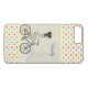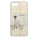Chic und moderne, personalisierte Geschenke und Zusätze mit einem eleganten Mädchen, das Fahrrad mit dem Eiffel-Tuch im Hintergrund fährt. Verziert mit einem mehrfarbigen Polkapunktmuster.