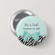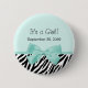 Ein Chic Aquamarine ist es ein Mädchengeburts-Mitteilungsknopf mit einem trendy Schwarzweiss-Zebradruck und einem niedlichen Aquaminzenband, die in einen girly Bogen gebunden werden. Personifizieren Sie diesen stilvollen Tiermuster-Babypartyzusatz, indem Sie den Namen Ihres neuen Babys und ihr Geburtsdatum dem kundenspezifischen Textbereich hinzufügen. Ebenedruckbild, nicht tatsächliches Band. Ursprüngliches Kunstcopyright von ©PartyPlans