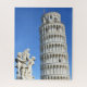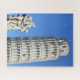 Dieses herausfordernde Rätsel zeigt ein originelles Foto des hübschen schiefen Turms von Pisa (Toskana, Piazza dei Miracoli) mit der Statue des Putti-Brunnen, zwei der berühmtesten italienischen Sehenswürdigkeiten, unter einem klaren blauen Himmel.